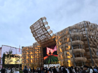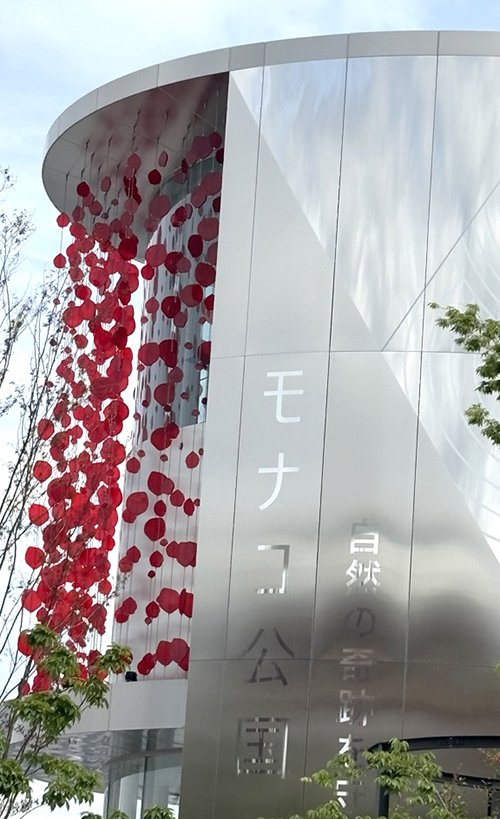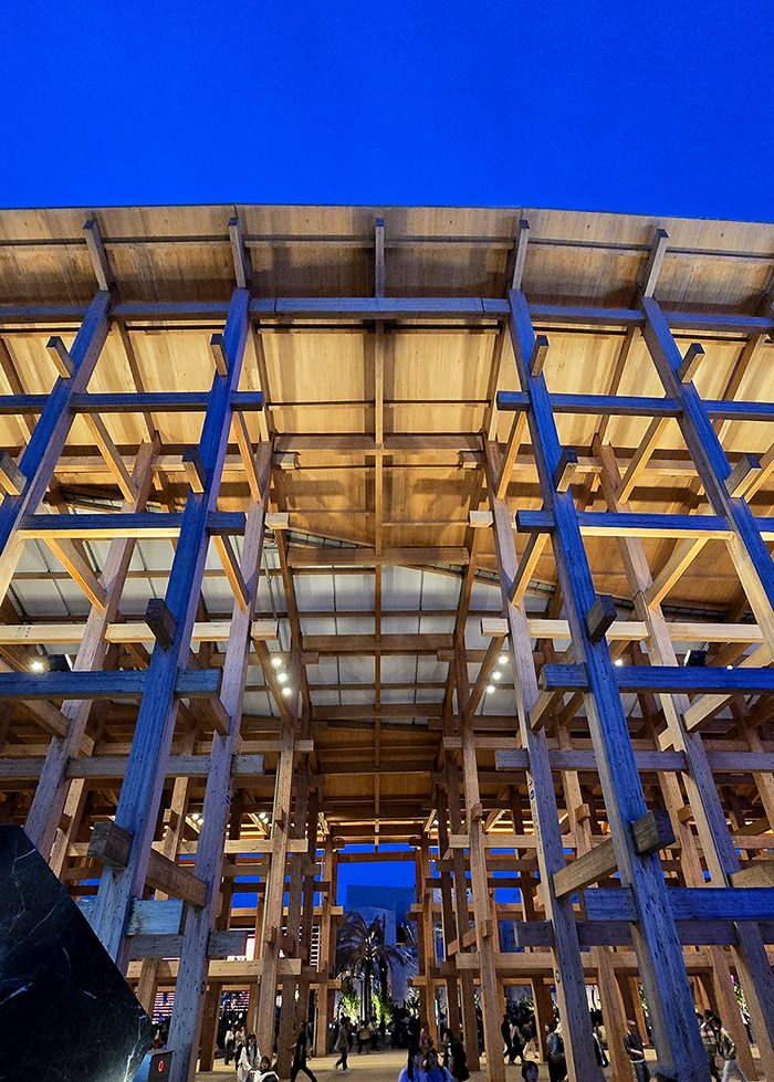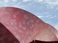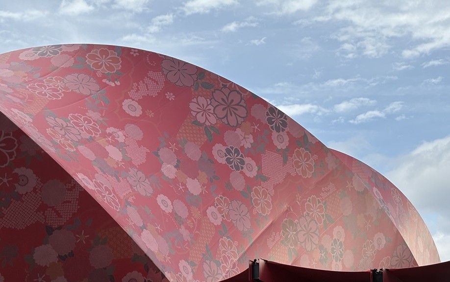 これは、飯田グループホールディングスという会社と、大阪公立大学が一緒に作ったパビリオンで、なんと、西陣織という日本の伝統の布でできていた!
